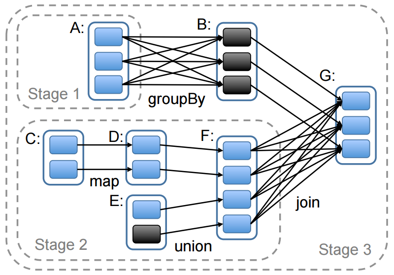 Example of a lineage of RDDs. Also shows the job stages. Boxes with solid outlines are RDDs. Partitions are shaded rectangles, in black if they are already in memory. In this case, stage 1’s output RDD is already in RAM, so the scheduler runs stage 2 and then 3.